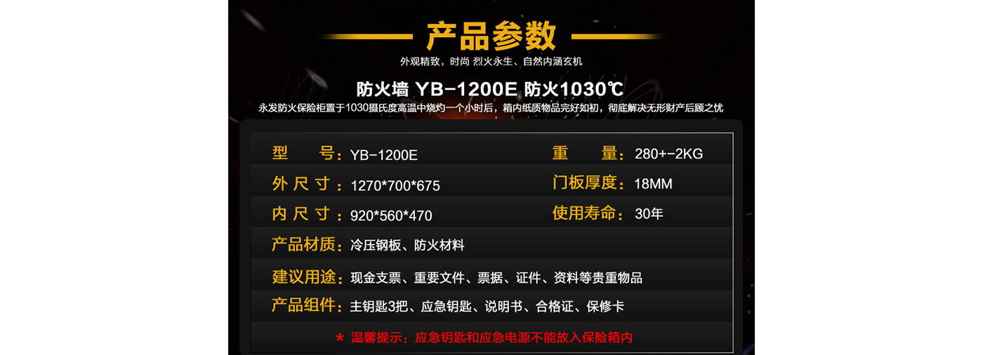 永發(fā)電子防火柜YB-1200E尺寸說(shuō)明:1270高*700寬*675深mm(含底座) 重量:280kg