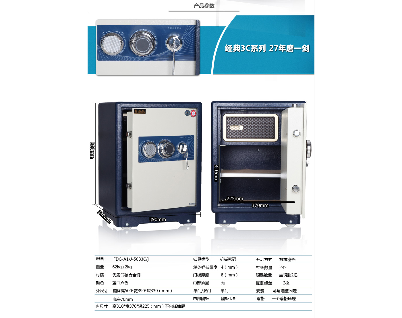 永發(fā)經(jīng)典機械系列3C認證保險箱J-50B3C尺寸說明:570高*390寬*330深mm(含底座) 重量:62kg